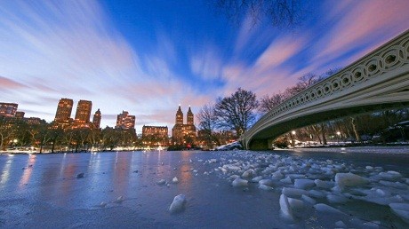 Axar.az xəbər verir ki, şəhərin rəmzi məkanlarından olan Sentral Parkın buz tutmuş gölləri, Günəşin batması zamanı azalan işıqların təsiri ilə gözəl görüntülər ortaya çıxıb.