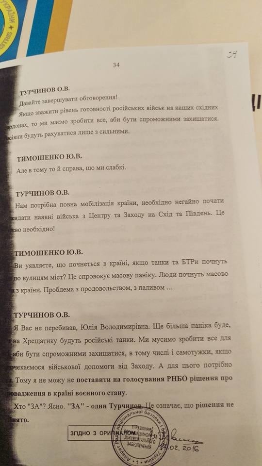 Axar.az xəbər verir ki, stenoqramın mətni Şuranın saytında yerləşdirilib. Yayılan mətnə əsasən, iclasda Milli Təhlükəsizlik və Müdafiə Şurasının sədri Aleksandr Turçinov, Ukrayna Təhlükəsizlik Xidmətinin keçmiş rəhbəri Valentin Nalivayçenko, Daxili İşlər naziri Arsen Avakov, keçmiş Müdafiə naziri İqor Tenyux, keçmiş Baş prokuror Vitali Yarema, Baş nazir Arseni Yaçenyuk və Batkivşina Partiyasının rəhbəri Yuliya Timoşenkonun iştirak etdiyi müəyyən edilib. Fevral ayında keçirilən iclas zamanı Turçinovdan başqa hər kəs Rusiya ilə müharibənin əleyhinə çıxıb. Timoşenko isə riskə getməməyi və şura üzvlərini ölkədə hərbi vəziyyətin əleyhinə səs verməyə çağırıb. Maraqlı məqam odur ki, Timoşenkonun bu çıxışı belə Turçinovu fikrindən döndərməyib.