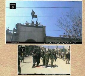 Bölgəni ələ keçirən İŞİD Suriya bayraqlarını endirib yerinə tövhid bayrağını asıb.