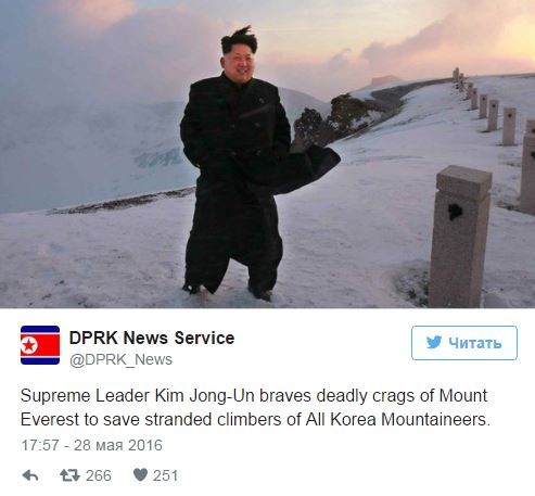 Şimali Koreyanın dövlət informasiya agentliyinin rəsmi Tvitter mikrobloqunda ölkənin lideri Kim Çen Inın dünyanın ən yüksək zirvəsi olan Everestdə şəkli yerləşdirilib.