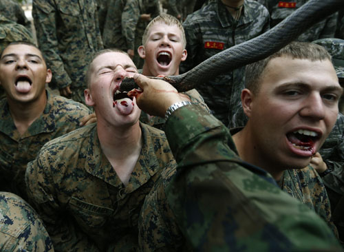 ABŞ Dəniz Düvvələrinin əsgərləri, təlim prosesində kobra qanı içərkən lentə alınıb.
