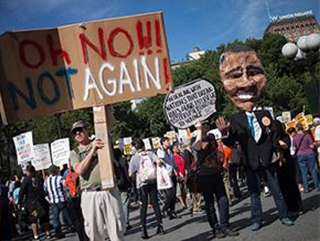 Nümayiş zamanı Buş və Obamanın şəkillərinin olduğu plakatlardakı