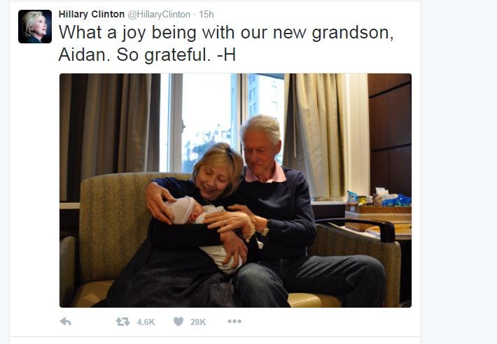 Musavat.com xəbər verir ki, Hiillari Klinton özünün, həyat yoldaşı, ABŞ-ın keçmiş prezidenti Bill Klintonla yeni doğulmuş nəvələri birlikdə şəkli öz tvitter hesabında paylaşıb.