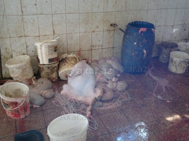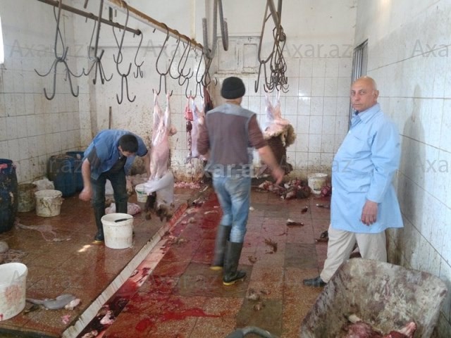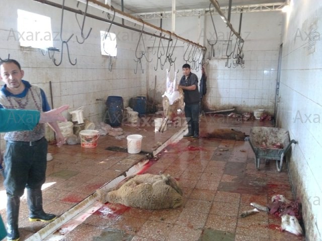 laborant fəaliyyət göstərir. Kəsilən heyvanlar diri alınıb