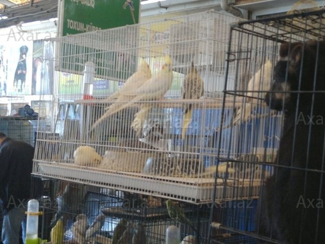İri qəfəslərdə müxtəlif növ tutuquşu və cins itlər satan oğlana