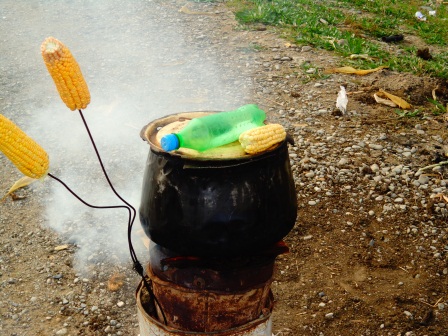 üstündəki qazanlarda qaynadılan qarğıdalıların iyi ətrafa yayılır.