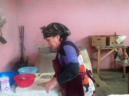 İçəri keçirəm, iki qadın çörək bişirməklə məşğuldur. Qadınlardan