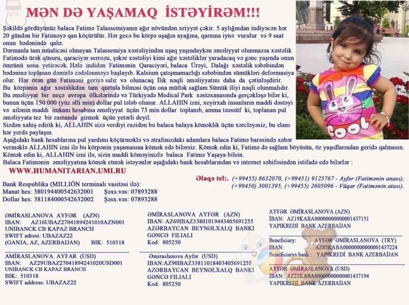 Bu sözləri "Axar.az"a ünvanlandığı müraciətində talassemiya