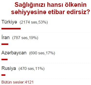 4118 nəfərin iştirak etdiyi sorğuda oxucuların 19%-i İran səhiyyəsinə daha çox güvəndiklərini deyiblər. İştirakçıların 17%-i Azərbaycan həkimlərinə inandıqlarını bildiriblər. Ən maraqlı məqam Rusiya səhiyyəsi ilə bağlı qeydə alınıb. Respondentlər daha çox Rusiyaya müalicə üçün getdiklərini vurğulayıblar.