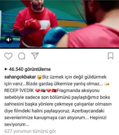 Ş.Gökbakarın bu tənqidə reaksiyası isə gecikməyib. İnstaqram hesabından sözügedən səhnənin fotosunu paylaşan aktyor aşağıdakıları qeyd edib: “Biz üzmək üçün yox, güldürmək üçün varıq. Bizdə qardaş ölkəmizə qarşı yanlışlıq olmaz. Fraqmandakı aksiyona görə sadəcə son bölümünü paylaşdığımız bosk səhnəsini başqa tərəfə çəkmək istəyənlər olmasın deyə filmdəki halını paylaşırıq. Azərbaycandakı sevənlərimizə qovuşmağa can atıram. Hamınızı sevirəm”.