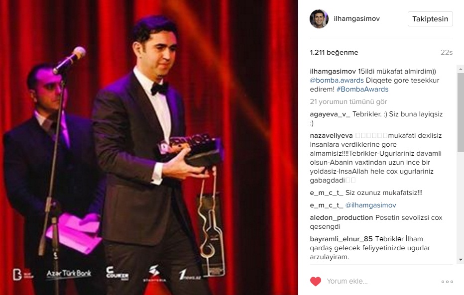 Qeyd edək ki, İlham Qasımov “Bomba” sosial media mükafatlandırma mərasimində rejissoru olduğu “Oğlan evi” filmi Yutubda ən çox izlənən video olduğu üçün mükafatlandırılıb.