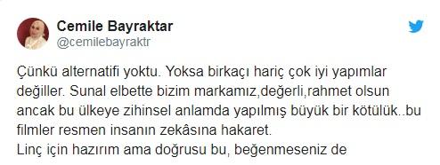 “Cəmilə Bayraqdar atamın filmlərini bəyənməyə bilər. Bu, çox da vacib deyil, amma filmlərinin bərbad və xalqa təhqir olması haqda fikirləri əsassızdır. Kamal Sunal kürəyini xalqa söykəmiş möhtəşəm bir insandır. Doğru olan tək şey budur”.