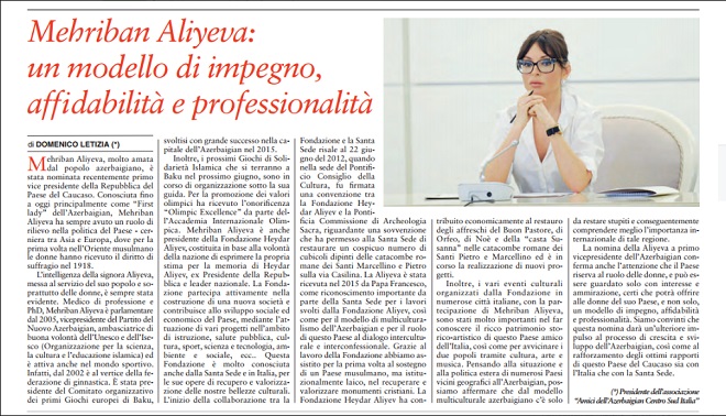 Axar.az “Azərbaycanın Mərkəzi-Cənubi İtaliyada dostları” assosiasiyasının sədri Domeniko Letisiyanın Azərbaycan Respublikasının Birinci vitse-prezidenti Mehriban Əliyeva haqda “L’Opinione” qəzetinin 14 mart 2017-ci il buraxılışında yayımlanan yazısını təqdim edir: