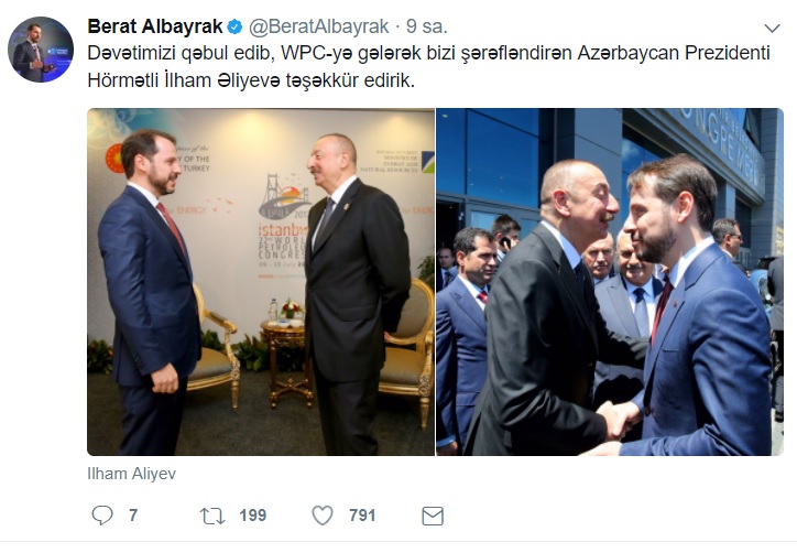 Axar.az xəbər verir ki, öz rəsmi hesabında tvit paylaşan Barat Albayraq Prezident İlham Əliyevə 22-ci Dünya Neft Konqresində iştirak etdiyi üçün, “Dəvətimizi qəbul edib, WPC-yə gələrək bizi şərəfləndirən Azərbaycan Prezidenti hörmətli İlham Əliyevə təşəkkür edirik” sözlərini yazıb.