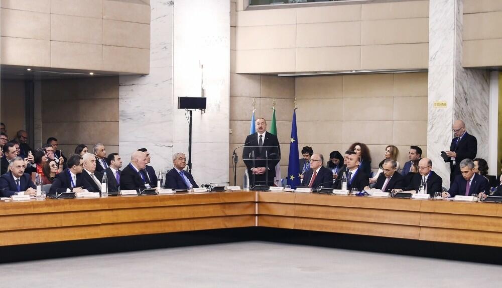İtaliya Azərbaycanın birinci ticari tərəfdaşı hesab olunur. On ildən az müddətdə bizim ticari əlaqələrimiz 70 faizə qədər artıb. Son on ildə İtaliyanın Azərbaycandan olan idxalı 55,5 milyon avro təşkil edib. Bu gün burada iştirak edən italyan şirkətləri müxtəlif sahələr - nəinki neft və qaz sahəsi, eləcə də digər sahələr üzrə fəaliyyət göstərirlər. Bu şirkətlərin əlaqələrimizin inkişafına öz dəstəyini verməsi gözlənilir. Son 15 ildə İtaliya şirkətləri tərəfindən Azərbaycanda qazanılmış tenderlərin dəyəri 7 milyard avro təşkil edir.