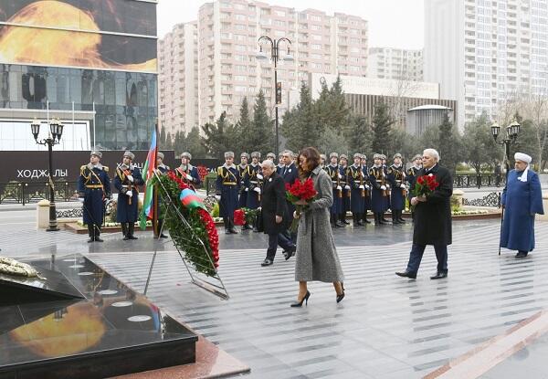Birinci xanım Mehriban Əliyeva, dövlət və hökumət nümayəndələri abidənin önünə gül dəstələri qoyublar.