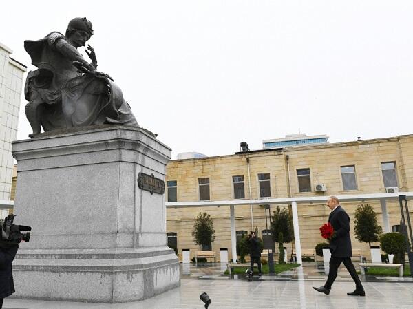 Dövlət başçısı heykəlin önünə gül dəstələri qoyub.