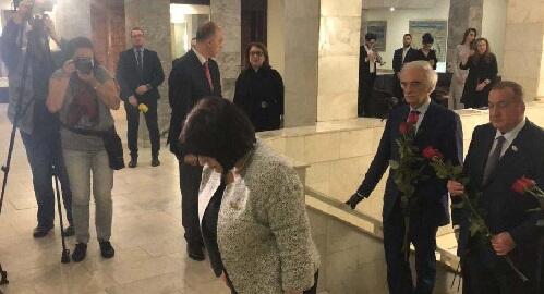 Spiker Azərbaycanın Rusiyadakı Səfirliyinə gələrək ümummilli lider Heydər Əliyevin barelyefi önünə əklil qoyub.