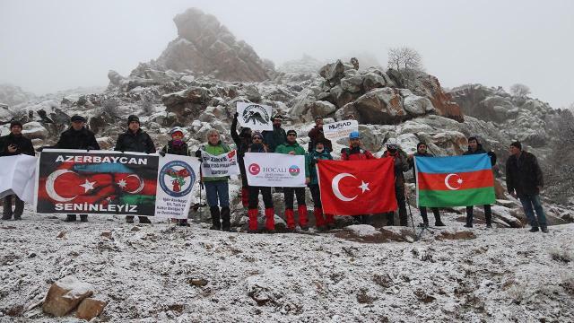 Alpinistlər dağın zirvəsinə Türkiyə və Azərbaycan bayraqlarını və "Xocalı şəhidlərini rəhmətlə və hörmətlə anırıq" pankartını sancıblar.
