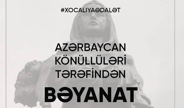 “Ölkədə fəaliyyət göstərən minlərlə könüllü adından Azərbaycan tarixinin ən faciəvi səhifələrindən biri – Xocalı soyqırımının beynəlxalq aləmdə tanıdılması, qan tariximizin gənc nəsil arasında təbliği və Xocalı soyqırımı qurbanlarının daim yad edilməsi ilə bağlı aşağıdakıları bəyan edirik:
