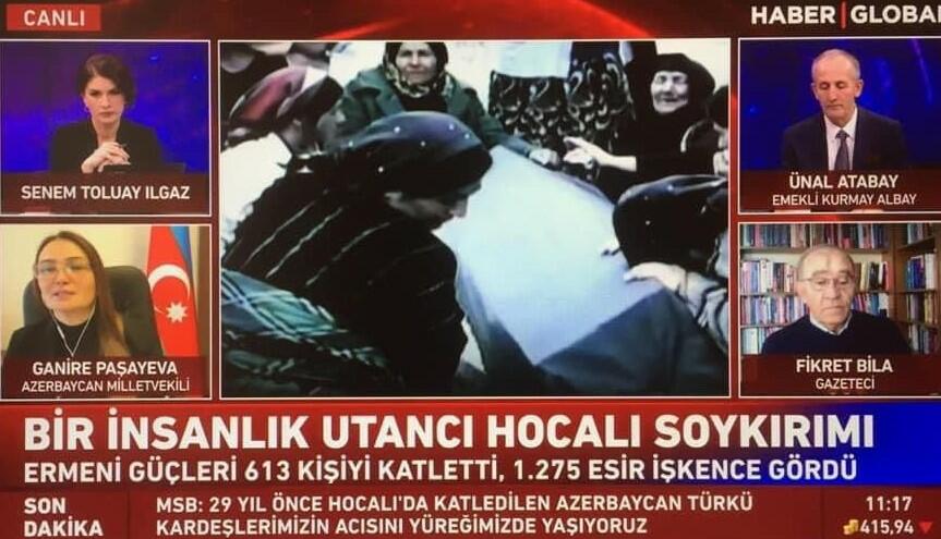 Millət vəkili Qənirə Paşayeva qardaş Türkiyənin "Haber Türk", "A Haber" və "Haber Global" televiziya kanallarının Xocalı soyqırımının 29-cu ildönümünə həsr etdiyi proqramlarda çıxış edib.