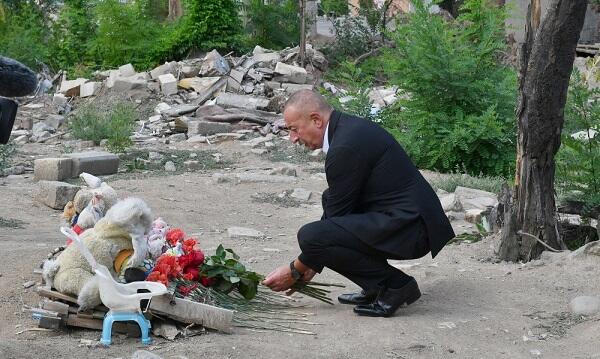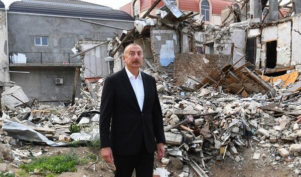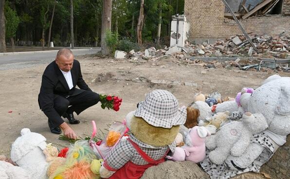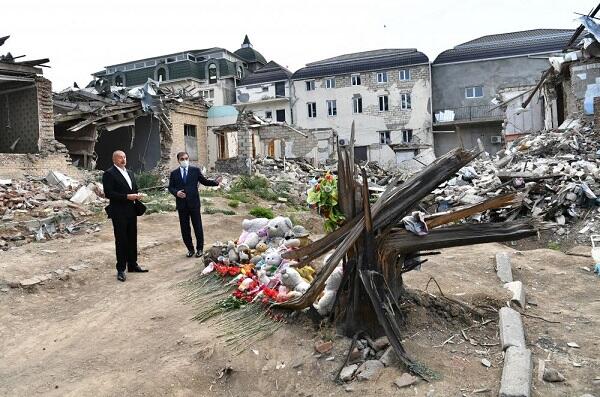 Erməni faşizminin izləri ilə tanış olan Prezident İlham Əliyev həlak olan dinc sakinlərin xatirəsinə ehtiram əlaməti olaraq, tamamilə dağılmış yaşayış binalarının ətrafına gül düzüb.