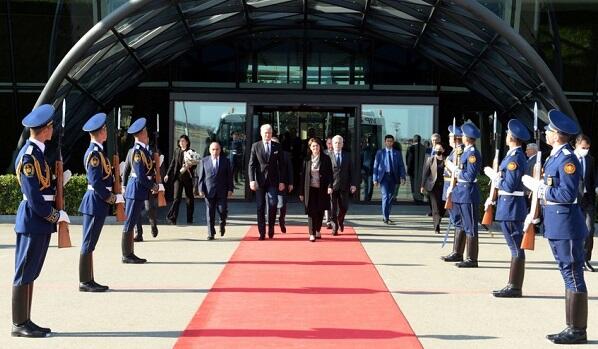 Axar.az xəbər verir ki, hər iki ölkənin dövlət bayraqlarının dalğalandığı Heydər Əliyev Beynəlxalq Aeroportunda ali qonağın şərəfinə fəxri qarovul dəstəsi düzülüb.