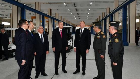 Prezident İlham Əliyev və Prezident Rəcəb Tayyib Ərdoğan Naxçıvan Bərpa-istehsalat hərbi kompleksinin rəmzi açılışını bildirən lenti kəsdilər.
