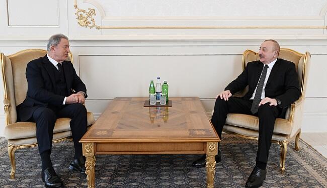 Hulusi Akar dövlət başçısına xatirə hədiyyəsi təqdim edib.