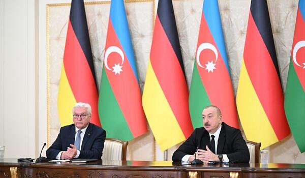 - Hörmətli həmkarım cənab Prezident, bu səmimi dəvətə görə ürəkdən çox təşəkkür edirəm və qonaqpərvərliyə görə bütün alman nümayəndə heyətinin adından təşəkkür edirəm. Biz burada bundan çox zövq alırıq. Siz dediniz ki, Azərbaycanda birinci dəfə deyiləm, bu funksiyada ilk dəfəyəm. Prezident kimi birinci dəfə gəlirəm. Əvvəllər Azərbaycanda dəfələrlə olmuşam. Amma axırıncı dəfə 2016-cı ildə olub, doqquz il keçib üstündən. İndi dünyada vəziyyət elə tez dəyişir, geosiyasi baxımdan 9 ildə o qədər dəyişikliklər olub ki, 2016-cı ildə buraya səfərim mənə artıq uzaq keçmiş kimi görünür. Ona görə şadam ki, bu gün yenidən gəlib görüşdük və çox geniş fikir mübadiləsi apara bildik. Biz həmişə bu mübadiləni aparmışıq. Bakıda olmasa da, başqa yerlərdə görüşmüşük, telefonla söhbət etmişik. Bu aralarda Münxen Təhlükəsizlik Konfransında görüşmüşük, eləcə də Sizin Berlinə səfərinizi yaxşı xatırlayıram. Keçən il baş tutan bu görüşdə müzakirə aparmışıq və şadam ki, mən indi Sizin səfərinizin qarşılığı olaraq ölkənizdə səfərdəyəm.