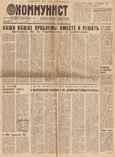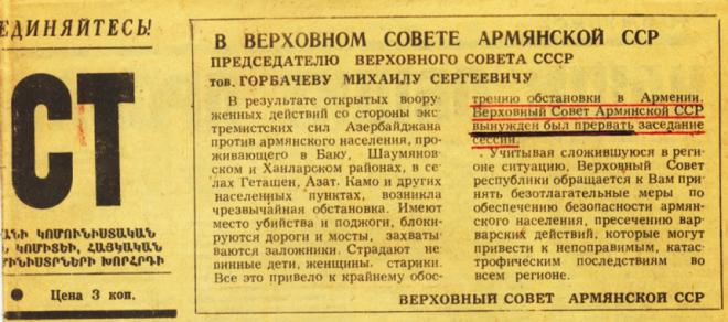 Məsələ ondadır ki, qəzetin həmin nömrəsinin eyni səhifəsində, lap yuxarı hissəsində əsas informasiya olaraq SSRİ-nin satqın rəhbəri, başıbəla, xəyanətkar M.Qorbaçova ünvanlanmış rəsmi müraciətdə Ermənistanın 11-ci çağırış Ali Sovetinin sessiyasının “işində” fasilə verilməsi erməni hiyləgərliyi ilə, saxtakarlıqla bir cür yozulur, sessiya haqqında elə həmin səhifənin aşağısında dərc olunmuş rəsmi məlumatda isə tamam başqa cür - olduğu kimi əsaslandırılırdı.