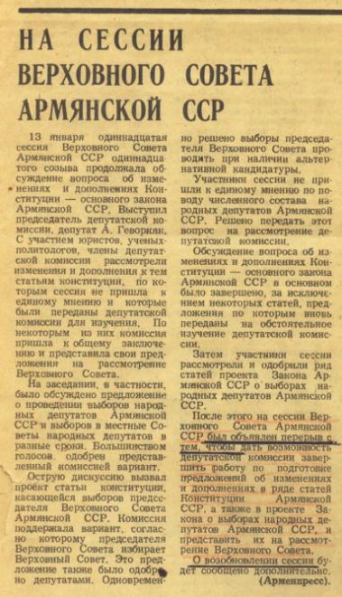 “Armenpress”in rəsmi informasiyasında sessiya haqqında məlumatın sonunda qeyd olunur ki, deputat komissiyalarının “bəzi məsələlər” üzrə hazırlıq işlərinə yekun vurulması, Ermənistan SSR-in konstitusiyasına dəyişiklik edilməsi üçün təkliflərin hazırlanması məqsədilə Ermənistan SSR Ali Sovetinin sessiyasında fasilə elan edilmişdir. Həmin informasiyada Qarabağ və Ermənistan-Azərbaycan münasibətləri barədə bircə kəlmə də işlədilməmişdir.