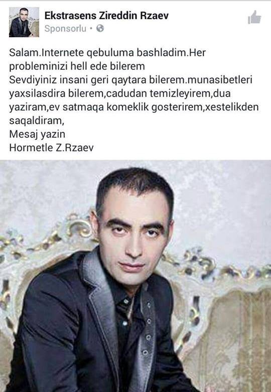 Axar.az xəbər verir ki, özünün Feysbuk səhifəsində bu barədə məlumat verən ekstrasens hər problemi həll edə biləcəyini deyib: