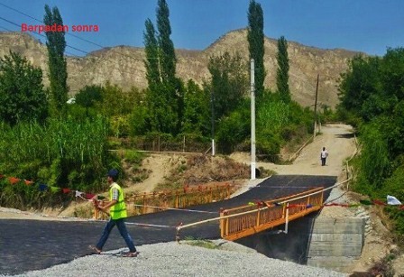 Azəravtoyol ASC-dən Axar.az-a verilən məlumata görə, ötən ay güclü sel suları nəticəsində dağılan körpünün uzunluğu 12 metr, eni isə 6 metrdir. Hadisə baş verən kimi dərhal əraziyə qurumun rəhbərliyinin tapşırığı ilə canlı qüvvə və texnika cəlb olunub. Dağılmış körpünün dayaqlarından biri yenidən inşa edilib, digərində isə əlavə bərkitmə işləri aparılıb. Daha sonra metal karkaslı beton aşırım tirləri qoyularaq bərkidilib, üstü isə asfaltlanıb.