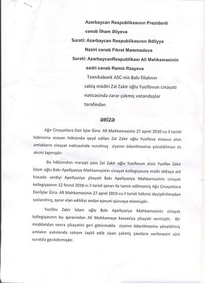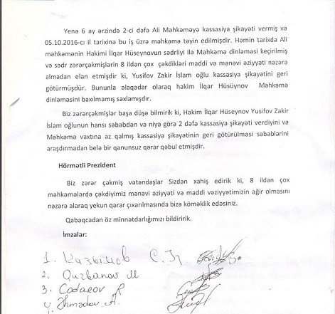 Şikayətçilərin sözlərinə görə, Zakir Yusifov Bakı Apelyasiya