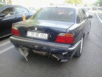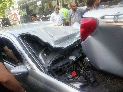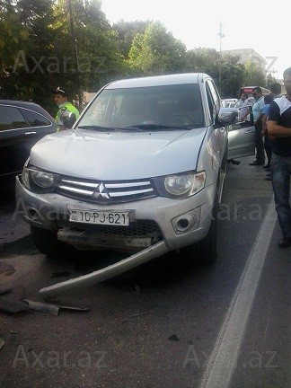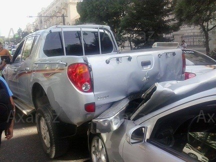 Axar.az xəbər verir ki, işıqforda gözləyən "Mitsubişi" markalı 10 PJ 621 dövlət nömrə nişanlı avtomobili "Mersedes" markalı 90 MB 929 dövlət nömrə nişanlı avtomobil vurub. "Mitsubişi" markalı avtomobil isə zərbə nəticəsində önündə dayanmış BMV markalı 005 BE 004 nömrə nişanlı avtomobilə çırpılıb. Zərbənin təsirindən "Mersedes"ə ciddi ziyan dəyib.