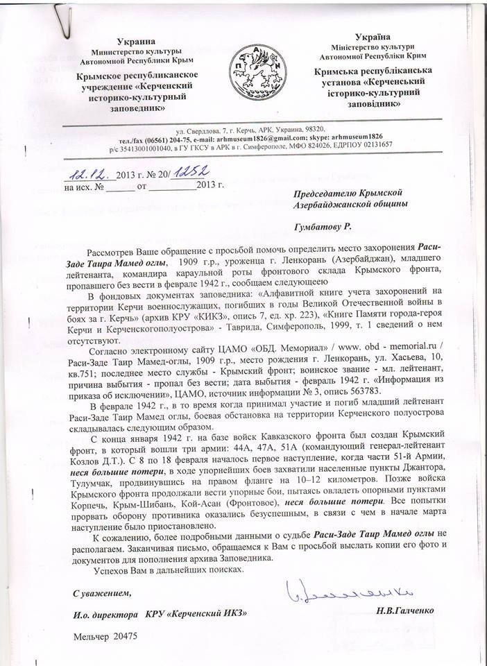 "Kiçik leytenant Rasizadə Tahir Məmməd oğlu Krım cəbhəsində