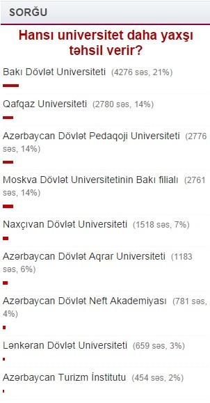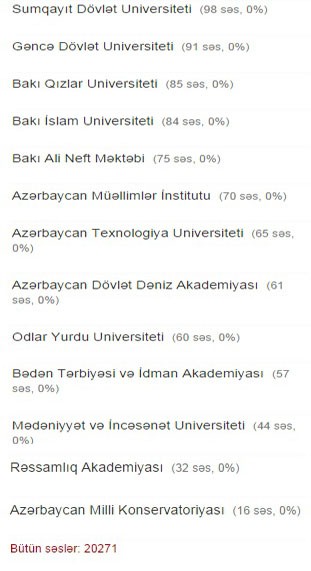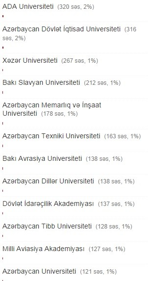 Respondentlər ilk üçlüyə Bakı Dövlət Universiteti (4.276 səs),