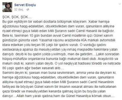 Məlumata görə, Cəmil Həsənlinin qızı Günel Həsənli Yasamal rayonunda ona məxsus KİA markalı avtomobilini idarə edərkən yolu keçən 86 yaşlı bir qadını vurub.