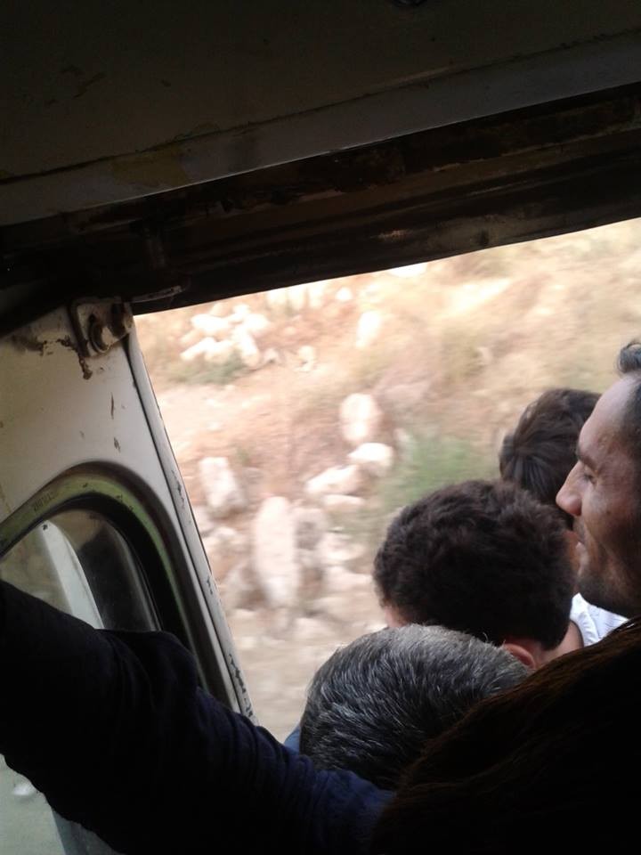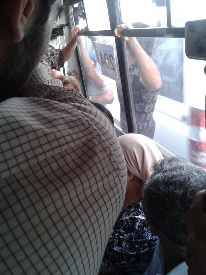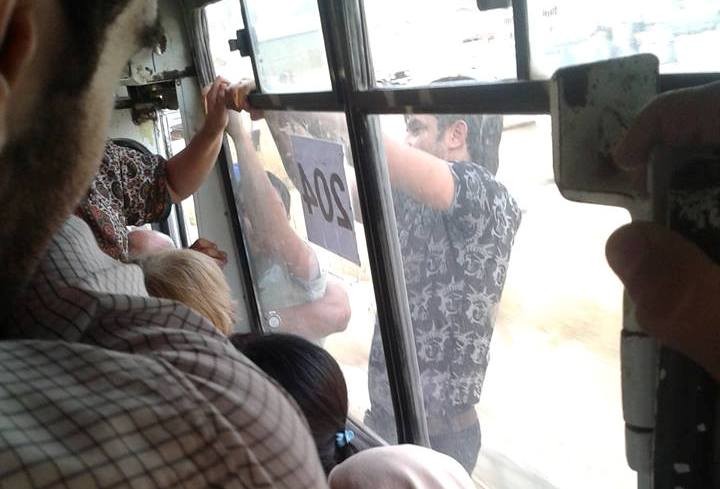 Onlardan biri qapının açıq qalmasından istifadə edərək pilləkənlərdə dayanıb. Digər sərnişin isə avtobusun çən qapağının üstünə ayağını qoyaraq pəncərənin çərçivəsindən yapışıb.