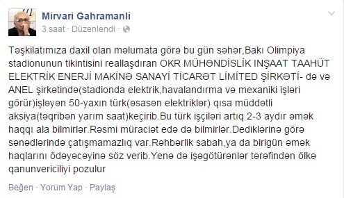 "Təşkilatımıza daxil olan məlumata görə, bu gün səhər, Bakı Olimpiya Stadionunun tikintisini reallaşdıran"OKR" Mühəndislik İnşaat Taahüt Elektrik Enerji Makinə Sanayi Ticarət Limited Şirkətində və ANEL şirkətində (stadionda elektrik, havalandırma və mexaniki işlər görən) işləyən 50-yə yaxın türk (əsasən elektriklər) qısa müddətli aksiya keçirib. Bu türk işçiləri artıq 2-3 aydır əmək haqqı ala bilmirlər. Rəsmi müraciət edə də bilmirlər. Dediklərinə görə, sənədlərində çatışmamazlıq var. Rəhbərlik sabah və ya birigün əmək haqlarını ödəyəcəyinə söz verib. Yenə də işəgötürənlər tərəfindən ölkə qanunvericiliyi pozulur".