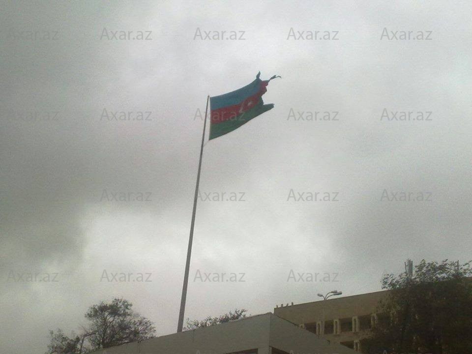 Xatırladaq ki, adətən güclük külək zamanı qorunması üçün dövlət bayrağı aşağı endirilir. Nizami RİH-nin qarşısındakı bayraq isə endirilməyib və buna görə də zədələnib.