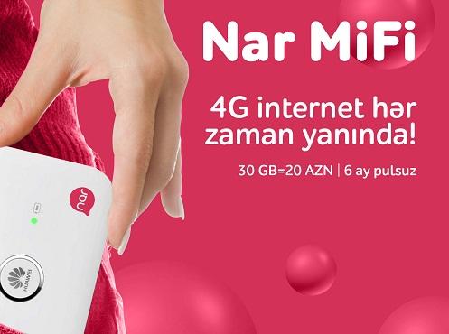 Ölkənin ən gənc və innovativ mobil operatoru “Nar” yüksəksürətli internetə çıxış imkanı verən “Nar MiFi” paketini təqdim edir. “Nar MiFİ” paketinə aylıq 30 GB olmaqla 6 aya qədər yüksəksürətli internet və daşınabilən MiFi cihazı daxildir. “Nar MiFi” paketinin ilkin qiyməti 120 AZN təşkil edir. Paketin daxilindəki pulsuz internet bitdikdən sonra, abunəçilər aylıq 20 AZN ödəməklə, 30 GB internet əldə edəcəklər.
