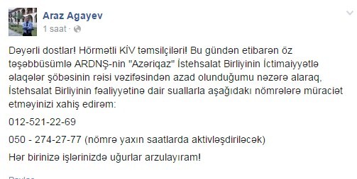 "Dəyərli dostlar! Hörmətli KİV təmsilçiləri! Bu gündən etibarən öz təşəbbüsümlə ARDNŞ-nin "Azəriqaz" İstehsalat Birliyinin İctimaiyyətlə əlaqələr şöbəsinin rəisi vəzifəsindən azad olunduğumu nəzərə alaraq, İstehsalat Birliyinin fəaliyyətinə dair suallarla aşağıdakı nömrələrə müraciət etməyinizi xahiş edirəm: