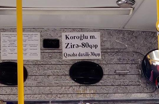 Sosial şəbəkələrdə Koroğlu Nəqliyyat Mübadilə Mərkəzindən Zirə qəsəbəsinə kimi fəaliyyət göstərən 187 nömrəli avtobusda gedişhaqqının 80 qəpik olması barədə xəbər vətəndaşlar tərəfindən təəccüblə qarşılanıb.