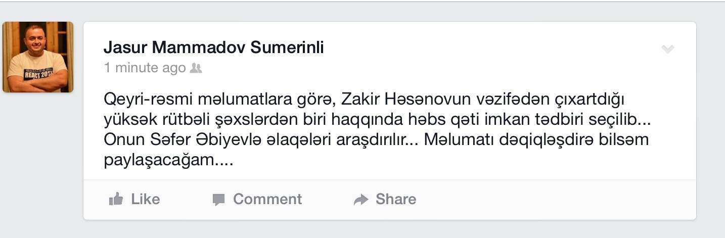 Azərbaycan prezidentinin sərəncamı ilə müdafiə naziri vəzifəsinə təyin edilmiş general-polkovnik Zakir Həsənovun işdən çıxardığı yüksək rütbəli zabitlərdən biri haqqında həbs qəti imkan tədbiri seçilib. "Axar.az"ın "Musavat.com"a istinadən məlumatına görə, bu barədə "Doktrina" Jurnalistlərin Hərbi Araşdırmalar Mərkəzinin direktoru Cəsur Sümərinli öz facebook profilində yazıb: "Qeyri-rəsmi məlumatlara görə, Zakir Həsənovun vəzifədən çıxartdığı yüksək rütbəli şəxslərdən biri haqqında həbs qəti imkan tədbiri seçilib... Onun Səfər Əbiyevlə əlaqələri araşdırılır... Məlumatı dəqiqləşdirə bilsəm paylaşacağam....".