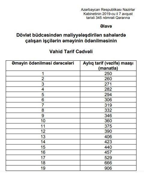 Yeni VTC-də tarif (vəzifə) maaaşları əməyin ödənilməsinin 1-19-cu dərəcələri üzrə 250-906 manat intervalında müəyyən edilib və bu VTC-nin tətbiqinə 1 sentyabr 2019-cu il tarixindən başlanacaq.