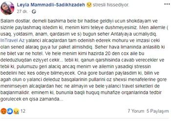 Axar.az xəbər verir ki, bu haqda məlumatı Leyla Məmmədova adlı zərərçəkən yayıb. Şikayətçi bildirib ki, “InTravel.Az” tur şirkətindən Türkiyənin Antalya şəhərinə tur-paket alıblar. Uçuş bu gün nəzərdə tutulsa da, səfər alınmayıb: