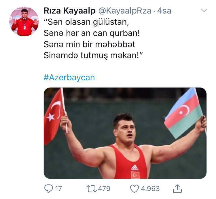 Publika.az xəbər veririr ki, bu barədə şəxsi Twitter hesabından paylaşım edən dünya çempionu əlində Azərbaycan və Tükiyə bayraqları olan şəkilini himnimizin sözləri ilə birlikdə izləyiciləri ilə bölüşüb: