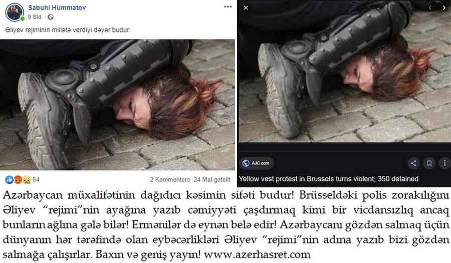 Lakin tanınmış jurnalist Azər Həsrət Səbuhi Hümbətovun yaydığı fotonun Azərbaycanda deyil, Belçikanın paytaxtı Brüsseldə bu ilin may ayında “Sarı jiletlilər”in aksiyaları zamanı çəkildiyini bildirib.